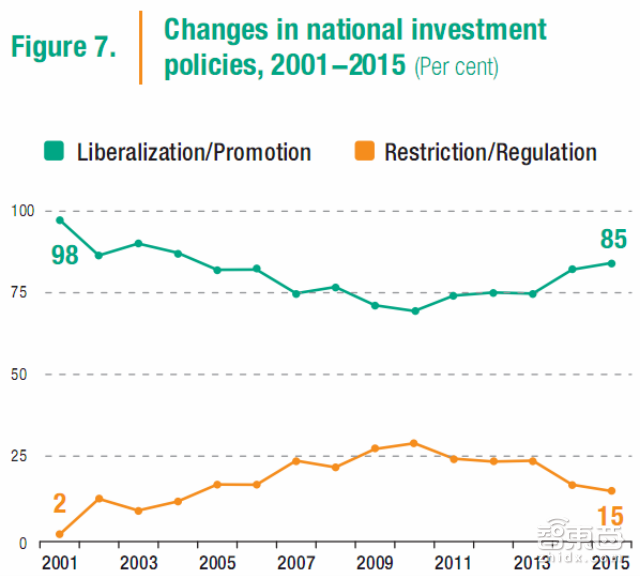 联合国贸发会议的数据显示,2015年共有46个国家和经济体采取了至少96项影响外商投资的政策措施。其中有71项与促进投资自由化相关,只有13项制定了新的投资规则和限制,另外12项则为中性性质的措施。促进投资自由化政策的占比达到了85%,高于近五年来的平均水平。