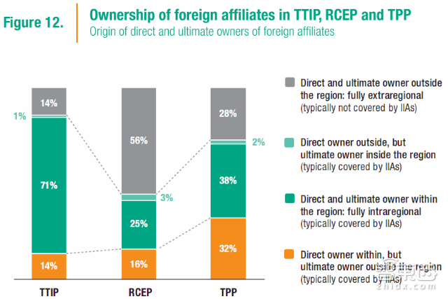 在国际层面上,政策制定者应该意识到,多边化正在从事实上对所有权的复杂性产生影响。投资条款中对投资和投资者的广义定义包括了大型跨国公司的广泛的海外分支且其在诸多行政辖区都较容易建立法人实体,这就显著地扩大了IIA的覆盖范围。这同样也与区域条款和条约谈判高度相关:TTIP中的七分之一以及TPP中三分之一的区域内跨国公司海外分支最终归属权都是该区域外的母公司,这也就放大了条款和谈判中涉及最终利益归属时的各种问题。
