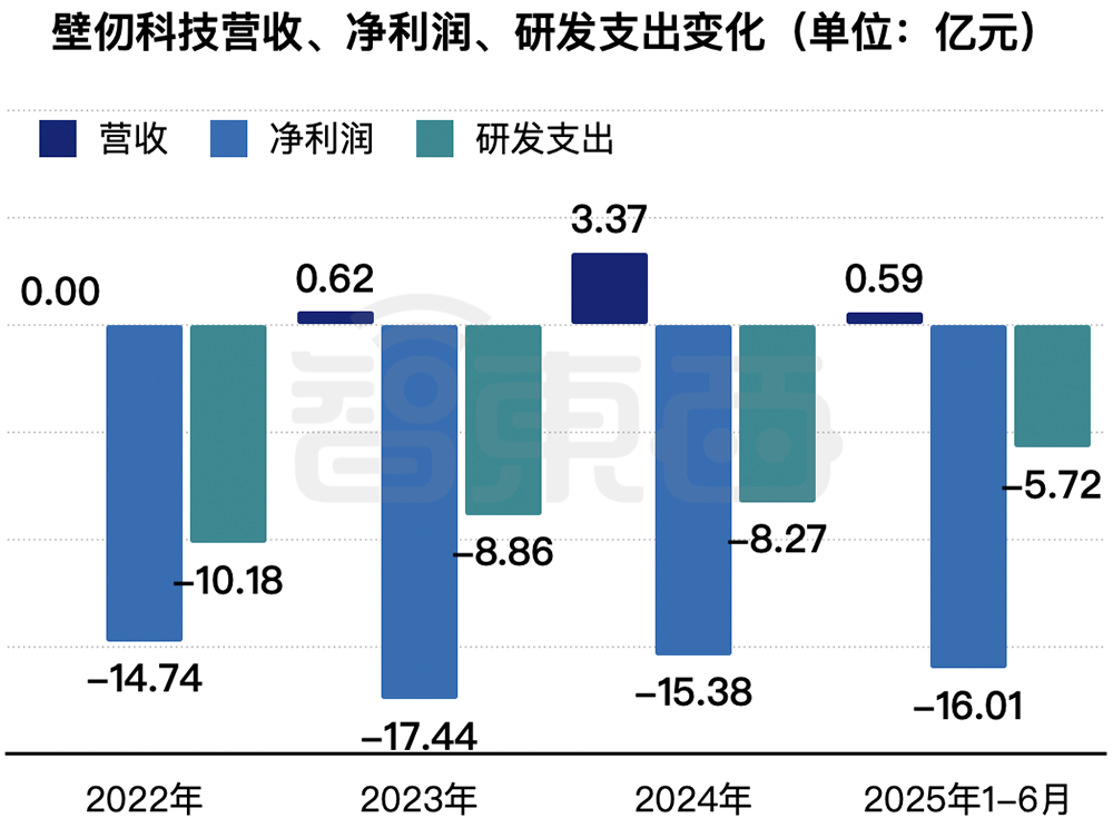 2022年、2023年、2024年、2025年1-6月,壁仞科技收入分别为49.9万元、6203万元、3.37亿元、5890万元,净利润分别为-14.74亿元、-17.44亿元、-15.38亿元、-16.01亿元,研发费用分别为10.18亿元、8.86亿元、8.27亿元、5.72亿元。