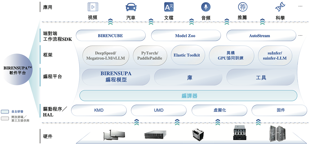 壁仞科技的BIRENSUPA软件平台采用分层架构,旨在优化性能、提高开发效率并支持广泛的AI应用。其GPGPU芯片也兼容主流第三方软件平台。