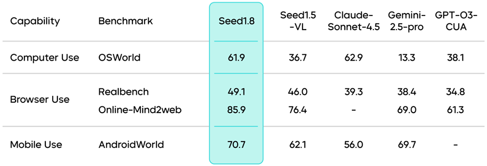 作为豆包家族的最新旗舰模型,豆包大模型1.8(Doubao-Seed-1.8)面向多模态Agent场景进行了定向优化。