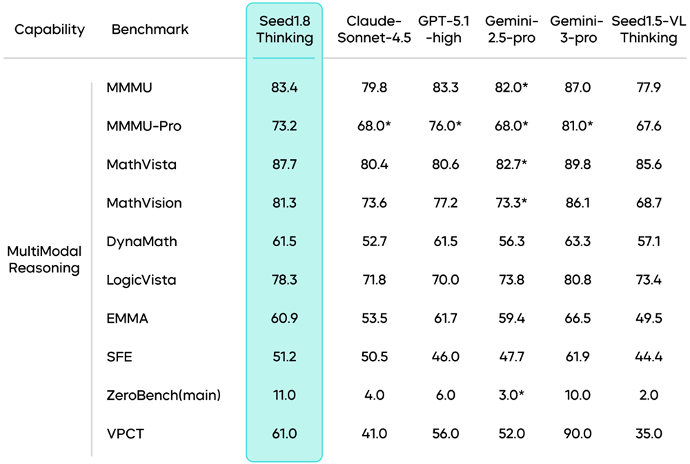 此外,豆包1.8在多模态推理任务中超越了前代模型Seed1.5-VL,在大部分任务中接近目前最先进的Gemini-3-Pro。