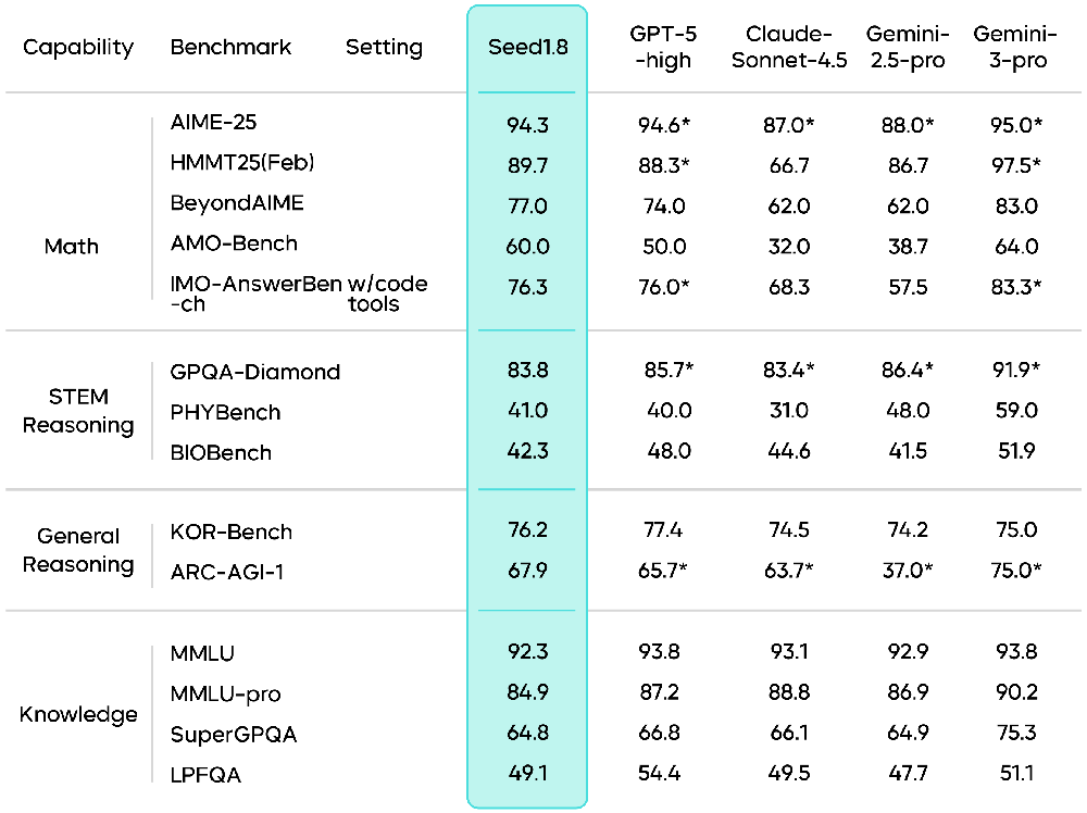 具体来看,在数学、推理和知识理解等核心基础能力维度上,豆包1.8的整体水平接近业界顶级通用模型。