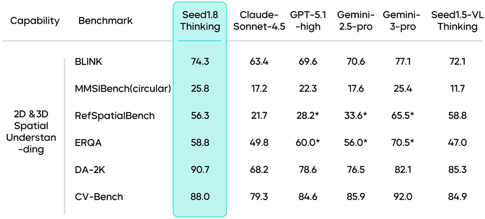 豆包1.8在2D及3D空间理解的多个基准测试中表现优秀,在处理3D空间理解和复杂任务时,特别是在动态和复杂数据集上,表现出较好的适应性和推理能力。