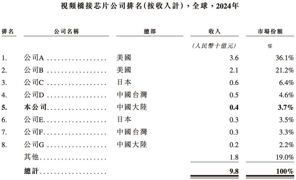 根据弗若斯特沙利文的资料,按2024年收入计,在视频桥接芯片市场,龙迅半导体是中国内地排名第一及全球前五的Fabless设计公司,收入达4亿元,市占率为3.7%。