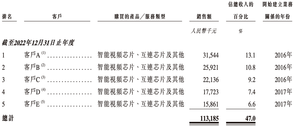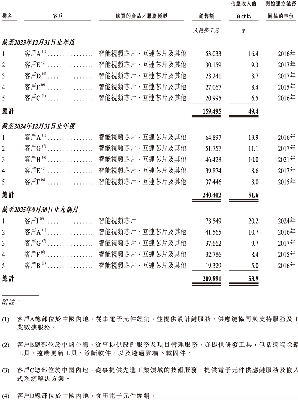 龙迅半导体的客户主要包括经销商。2022年、2023年、2024年、2025年1-6月,其来自前五大客户的收入分别占总收入的47.0%、49.4%、51.6%、53.9%。