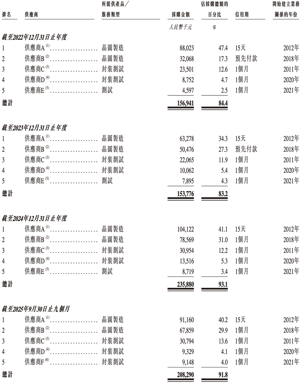 同期,其供应商主要包括晶圆代工厂及提供封装测试服务的公司,向前五大供应商采购的金额分别占采购总额的84.4%、83.2%、93.1%、91.8%。