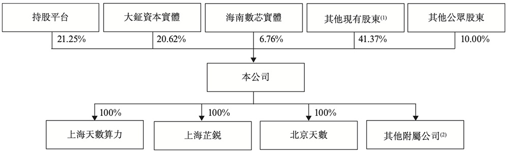 天数智芯所有权由其雇员通过多个特殊目的实体以及多元化的被动财务投资者持有。紧随全球发售后,其简化架构如下: