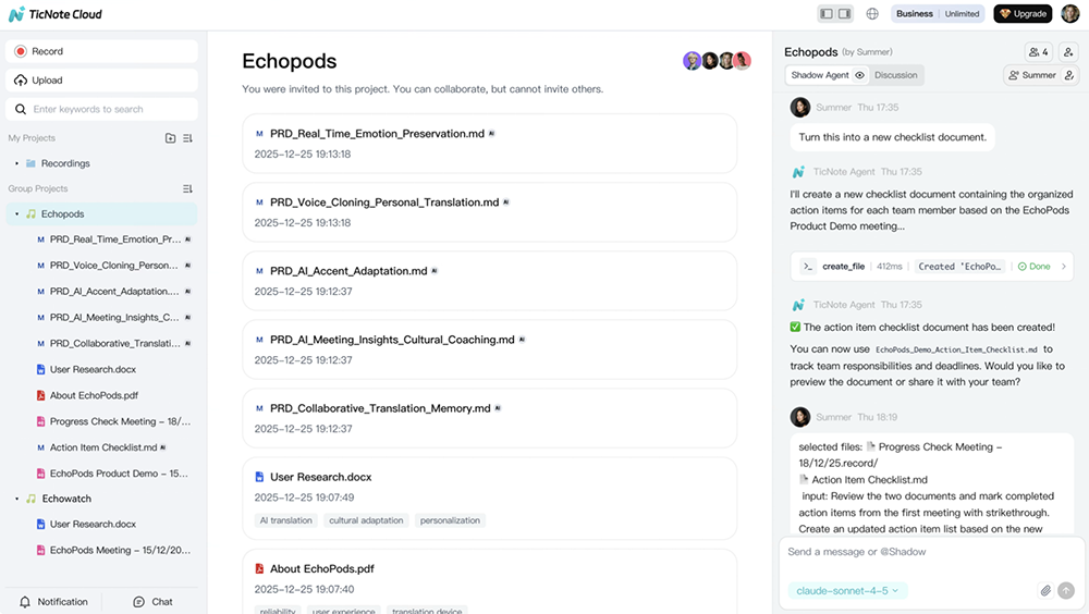 对于TicNote Cloud上创建的每一个项目,用户可以自由组建团队,进行讨论决策。Agent基于项目感知和指令,对文件进行操作,每一个想法的迸发、每一次的文件修改,都能实时同步给其他成员。