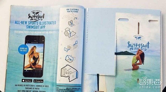 2015年,Sports Illustrated(《体育画报》)宣布,泳装特刊将会提供VR内容,同时还会送给读者一个VR观看器,许多人大吃一惊。观看器与谷歌Cardboard有点相似,戴上观看器,读者可以前往热带地区,与杂志中的模特共处。观看器平放在杂志内,有点像插页,用户需要花10分钟组装,里面有镜头。一旦组装完成,观看器就很强大了,和谷歌Cardboard一样。