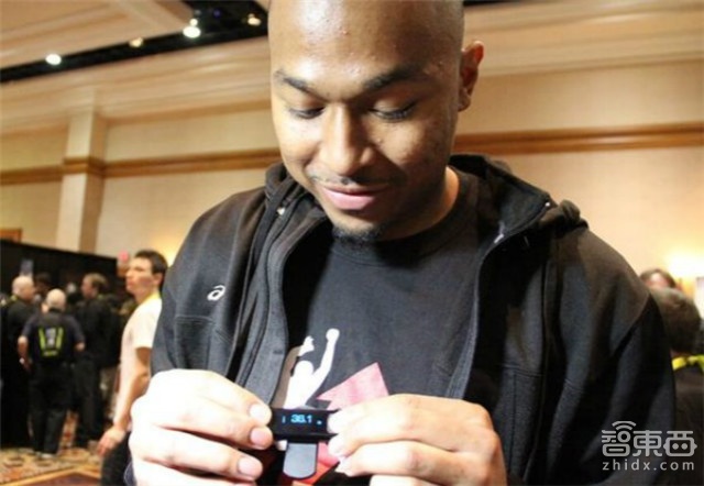 在角落附近,一名男子在反复地、尽可能高地跳上跳下。他是在演示一款类似Fitbit、可夹在衣服上的设备Vert。这款产品用于测量佩戴者的垂直起跳高度。在每次起跳之后,他的垂直高度数据将被显示在iPad上配套的Vert应用中。