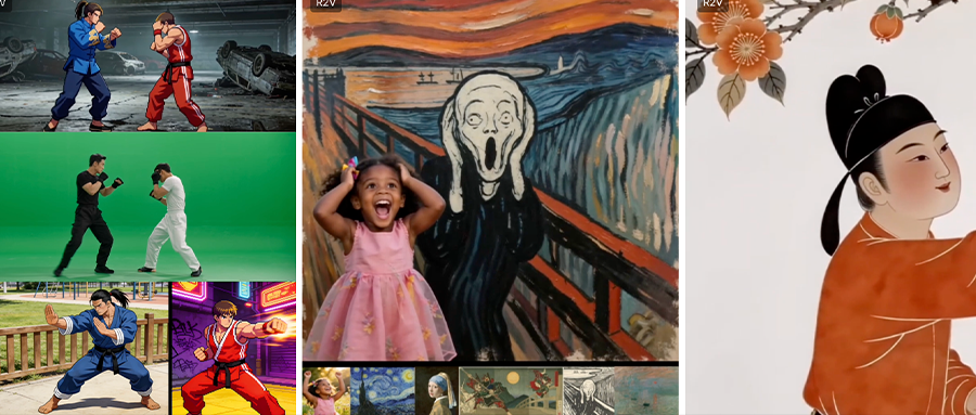 R2V prompt:@图片 1 女孩打破次元壁,连续穿越多幅名画世界,保留真实质感,油画世界呈现 3D 高饱和度动画风格。她站在 @图片 2 的旋转星空下神情激动;接着好奇看着 @图片 3 的情侣拥抱,情侣不好意思地用被子将头遮住;随后与 @图片 4 戴珍珠耳环少女一起自拍;紧接着进入 @图片 5 在两名武士中间穿过;与 @图片 6 一起扮鬼脸呐喊;跑到 @图片 7 蒙娜丽莎身旁,被摸头贴脸;在 @图片 8 女人面前转身换装,二人互行礼;随后与 @图片 9 中的梵高一起画画;最后背对镜头看夕阳,随即转身甜美一笑。对比度高,电影质感,转场丝滑无缝,人物鲜活。