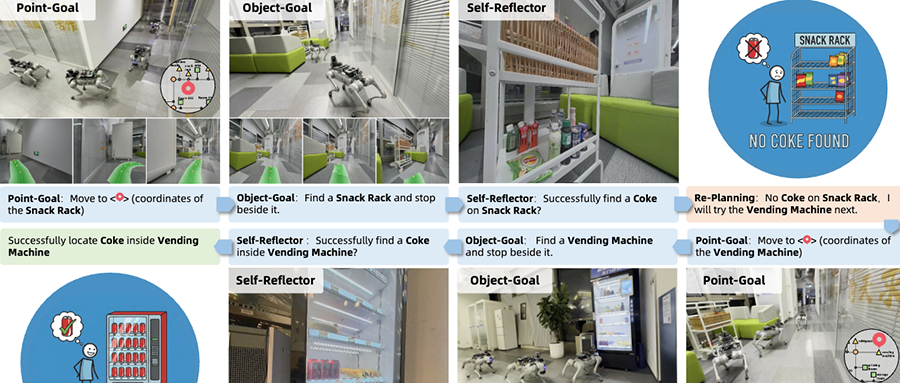 此外,为解决机器人在执行长程复杂任务时的任务拆解与容错问题,高德还提出了Agentic Navigation System具身导航系统框架,支持机器人在执行过程中持续感知、记忆、决策与纠错。该系统已部署于真实四足机器人平台。
