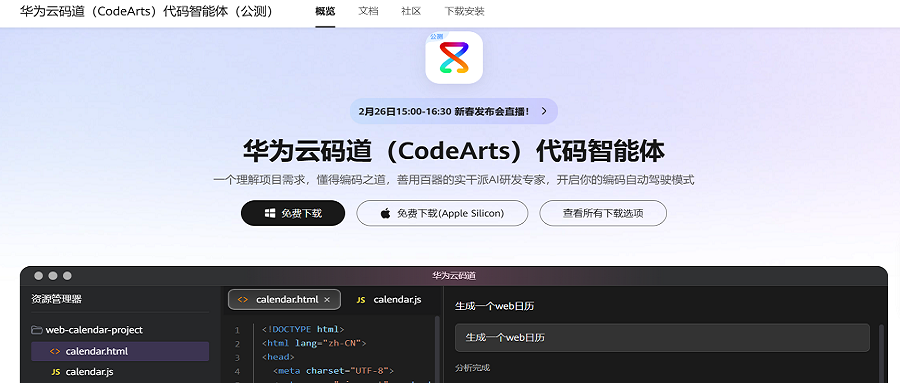 智东西2月26日报道,今天,华为云发布了码道(CodeArts)代码智能体公测版,这一代码智能体集代码大模型、IDE、自主开发模式为一体,覆盖代码生成、研发知识问答、单元测试用例生成、专家技能Skills、Codebase代码库索引、规范驱动开发等AI编程技术,支持项目级代码生成、代码续写、研发知识问答、单元测试用例生成等核心功能。