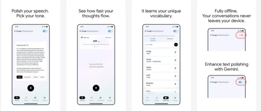 Eloquent并未纳入谷歌常规的消费级产品体系,而是以Google AI Edge名义发布。该体系主要面向开发者,提供在Android和iOS设备上本地运行AI模型的工具与SDK。这一归属让Eloquent不只是一个面向用户的语音工具,也承担了展示端侧模型能力的角色,用于向开发者和企业说明Gemma在实际场景中的落地能力。