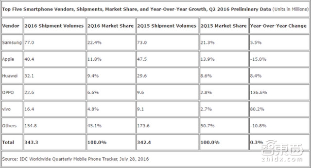 北京时间7月28晚间消息,国外媒体报道,IDC今日发布了2016年第二季度全球智能手机出货量报告。第二季度,全球智能手机出货量为3.424亿部,同比仅增长0.3%。