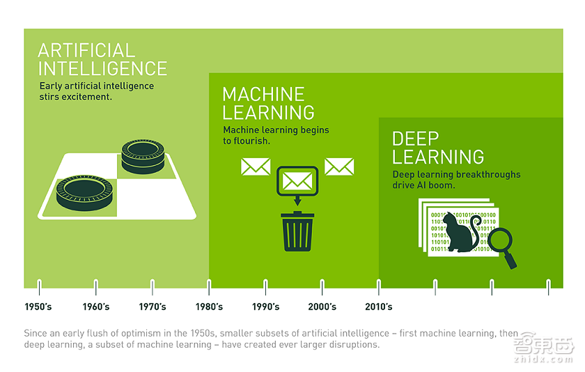 要搞清它们的关系,最直观的表述方式就是同心圆,最先出现的是理念,然后是机器学习,当机器学习繁荣之后就出现了深度学习,今天的AI大爆发是由深度学习驱动的。