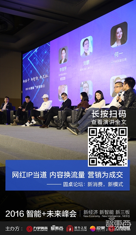 12月8日,由九宇资本、智东西、犀牛之星、极果、六合咨询共同主办的“2016智能+未来峰会”在北京北京JW万豪酒店揭开大幕。在这场近六百人的行业盛会上,来自投资界、创业圈和产业链各方40余位大佬登台演讲交锋,围绕“新经济、新智能、新三板”主题,探讨产业变革中的投资机会、人工智能时代下的新消费模式、汽车的智能化未来等,带来最前沿的实践、思考和判断。