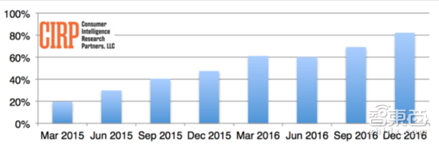 亚马逊于 2014 年底推出智能音箱 Echo,如今已成为美国使用最广的智能家居产品。根据 CIRP,自 2014 年 11 月发布到 2017 年 1 月,亚马逊 Echo 系列(包括 Echo、EchoDot 和 Tap)用户已达到 820 万,同比增长 2 倍,较 2016 年 11 月时的数据增长 60%。而公司 2017 年的销量目标是 1000 万。销量激增的背后是 Echo 正迅速从早期用户 的小众圈子进入大众市场。