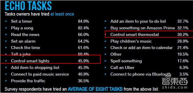 对于 Alexa 而言,控制智能家居用品是语音助手使用率高的应用之一,45.9%的用户用 Alexa 控制过智能灯,30.2%的用户控制过智能恒温器。而且,智能家居相关应用的第二周用户留存率高达 40%,远超语音应用平均 3%的水平。