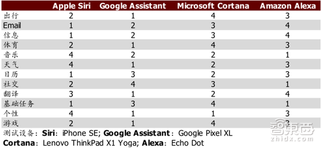 *Business Insider 为四巨头的智能语音功能评分(注: 1-4 为排名, 1 表示最好)