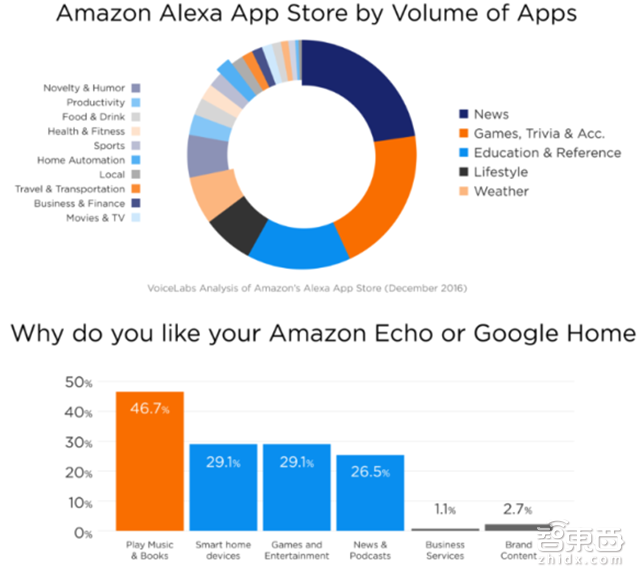 亚马逊的 Alexa 手机 App 和谷歌的 Home手机 App 起到语音应用商店的作用。受到推广的 Alexa 技能,新用户增长率可达 200%,平均每个应用的新增用户数量区间为 500~25 万人。但除此之外,普通用户很难发现新应用(不知道自己可能需要的某项功能已被开发成 Alexa 应用),也较难记住使用频次较低的应用。而除了部分交易型技能(如 Uber、Domino’s Pizza)天然具备盈利条件以外,其他技能尚无货币化手段。