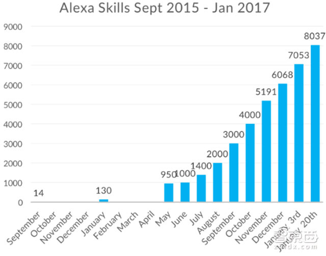 Alexa自去年 8 月起,平均每月新增技能约 1000 个。2017 年 1 月 3 日至 20 日仅 17 天内,新增技能便超过 1000 个,总技能数量已突破 8000 个。内置虚拟助手 Alexa 的基本功能包括点播音乐、询问天气/交通、播报新闻、添加日历行程、购买 Amazon 商品。而通过 Alexa Skill Kit(ASK)的 Alexa 第三方开发者数量已达到万人级别,可供使用的技能覆盖用户生活的方方面面,包括 Uber 叫车、查询 Capital One 银行账户余额、订 Domino’s 披萨、控制 Nest、SmartThings 等智能家居、玩 Jeopardy 游戏等等。