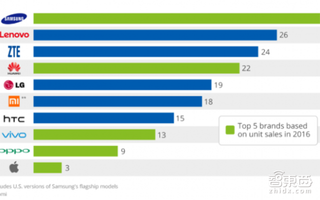 网上统计门户Statista最近的一份报告显示,三星发布了市场上最多的智能手机,而苹果最少。图表还显示了2016年单位销售量前5位的品牌列表。三星在2016年发布了31款智能手机,而联想及其摩托罗拉子品牌发布了26款智能手机,中兴发布了24款智能手机,华为发布了22款智能手机,LG发布了19款智能手机,小米发布了18款智能手机,HTC发布了 15款智能手机,Vivo发布了 13款智能手机,Oppo发布了 9款智能手机,苹果发布了3款智能手机。