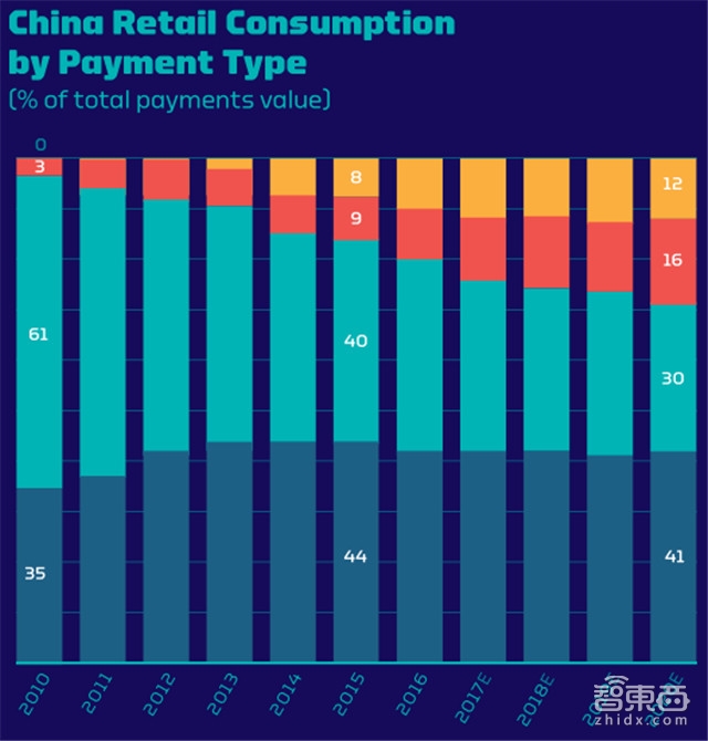 *图为中国零售市场交易方式变化趋势示意(色块自上而下代表移动支付、互联网支付、现金支付、卡支付)