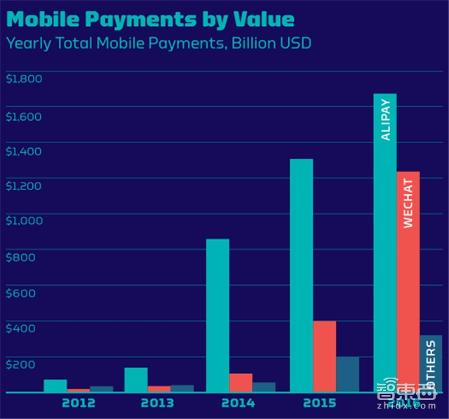 支付宝借助电商平台阿里巴巴发展其互联网支付服务,并在2009年推出手机端软件,截至2016年支付宝日军交易量达1.75亿宗,其中60%是通过手机完成的。高交易量和交易额使得支付宝的市值从2012年的700亿美元暴涨至2016年的11.5万亿美元