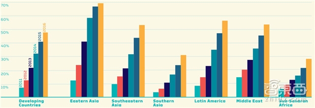 *图为2011-2016年间全球各地智能手机普及率示意