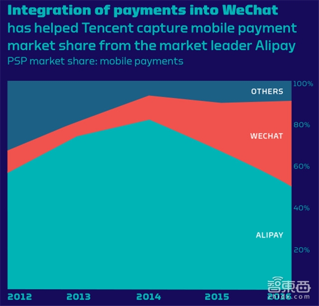 *图为2012-2016年支付宝和微信支付占移动支付市场份额示意