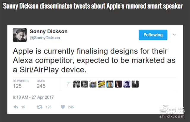 而在今年4月份,Sonny Dickson也预测Siri智能音箱将会在WWDC上出现,他是澳大利亚著名的科技博主,主要提供第一手的科技咨询、评论以及科技产品信息,曾屡次曝光苹果公司未发布的产品信息。Dickson在Twitter上表示,该产品将会作为“Siri/Airplay设备”上市,似乎也在证实该消息。