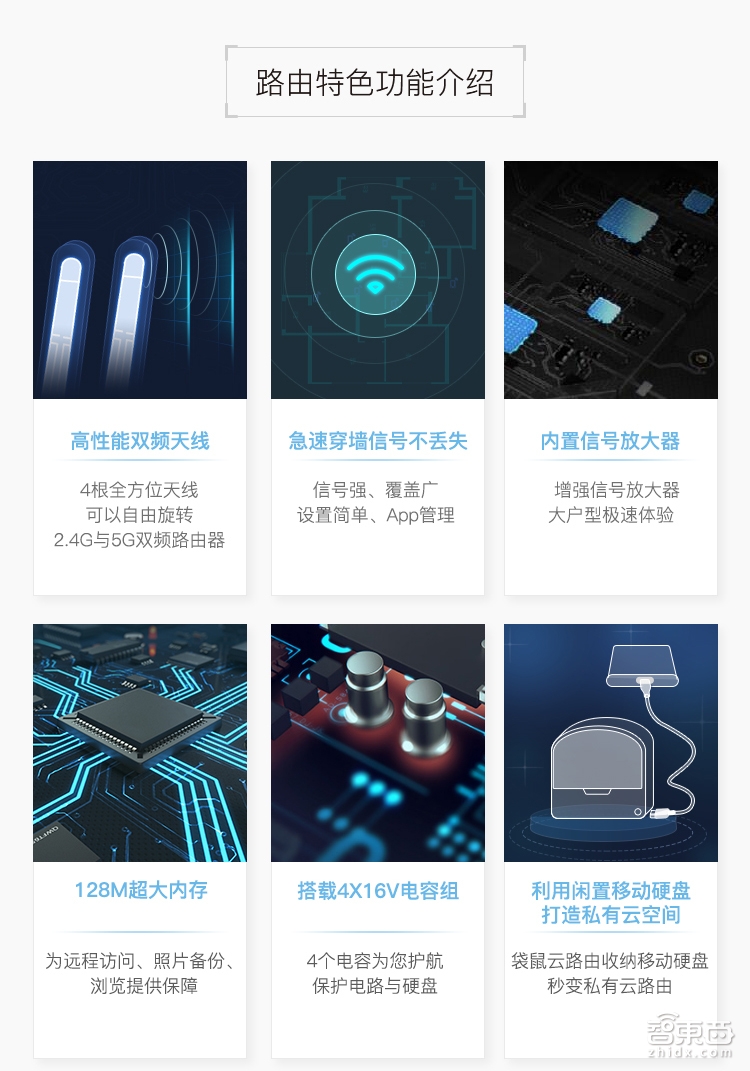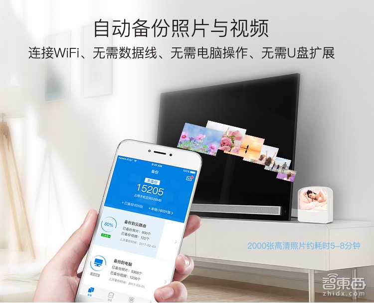 信号方面,2.4G+5.8G双频1200M的规格,满足手机WiFi接入后自动备份照片的使用需求。在5.8G的频段的测试显示:2000张手机高清照片只需要5-8分钟的时间。未来5.8G的频道会成为手机、电视等WiFi终端设备的标配,而5.8G的路由器也将慢慢普及。