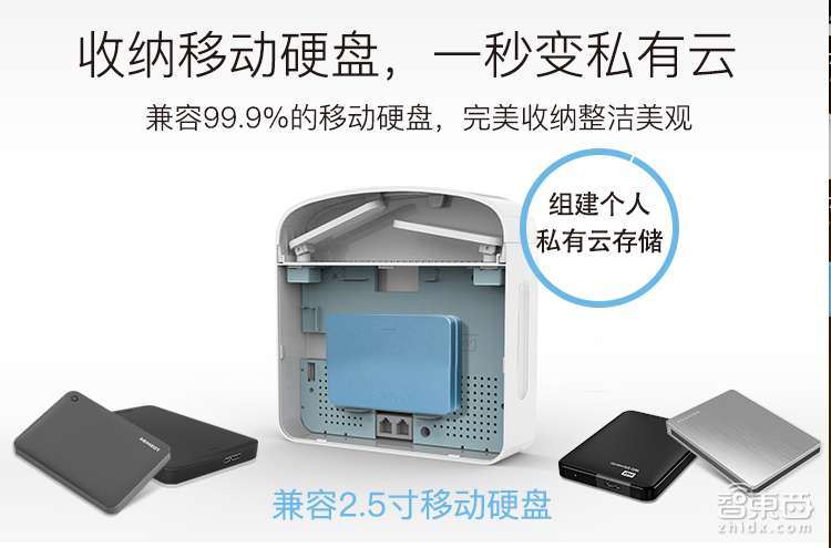 这款路由器有一个独立的收纳空间,可以收纳目前主流的:希捷、西数、日立、联想、爱国者等,2.5英寸以下的移动硬盘,接口方面无论是USB2.0、USB3.0还是type-c接口都可以使用。即使是用户使用硬盘盒自行组装的移动硬盘也可以。
