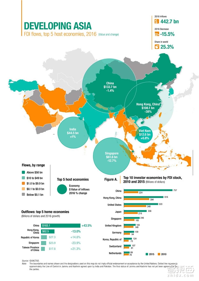 经济增长缓慢的情况下,继2015年外国投资激增之后,全球外国直接投资(FDI)下降了2%,达1.75万亿美元。流入发展中国家的资金减少,抵消了可观的发达国家经济体增长。2016年亚洲发展中国家的外国直接投资流入量下降15%至4430 亿美元,这是自2012年以来首次下降。三个亚洲次区域(东亚、东南亚和西亚)受到影响,只有南亚幸免。