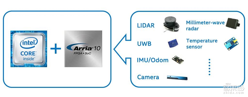 为了打造通用的机器人计算平台,我们选用了英特尔提供给移动平台使用的CPU和Arria 10系列的FPGA。两者通过高带宽,低延迟的I/O接口(如PCIe)进行通信。FPGA中可以包含多种加速模块。我们会提供一套通用接口,便于模块开发者包装、发布已有的设计。