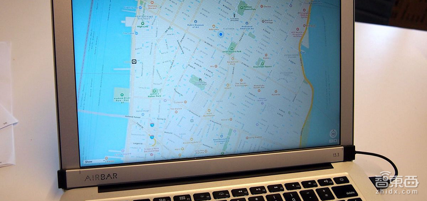 AirBar还有两个薄的印刷线,用来和屏幕的外边缘对齐。它需要用一根短电缆插入苹果笔记本的USB端口来进行连接。这个大约1/4英寸厚的AirBar贴在显示屏上时,不能把笔记本合上,如果你这么做的话 AirBar会看到你的手触摸到笔记本电脑的顶部边缘并发出警报。