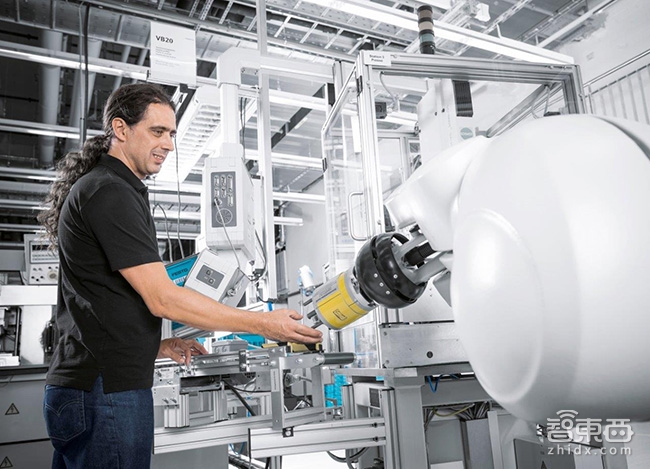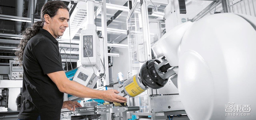 随着大规模工业机器人的使用,人如何与机器人和谐相处,保证人的安全,正成为一个重要的命题。在Scharnhausen工厂,智东西发现这一幕正在上演,在一个生产区,一个装配机器人和一个工人和谐相处。据透露,这是德国为数不多的无需安全防护网便可在员工身边进行工作的机器人之一。