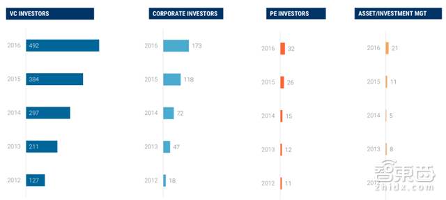 从投资方来看,随着技术进步和市场扩张,风投所占的AI相关领域的资本比例不断增加,参与者从2012年的127家增至2016年的492家,公司投资、私募、资产/投资管理参与者的数量也是逐年攀升。其中,比较活跃 的投资方包括Data Collective、英特尔资本、NEA、khosla风投、GV、硅谷天使投资基金、Accel Partners、PlugandPlay、通用催化风投。