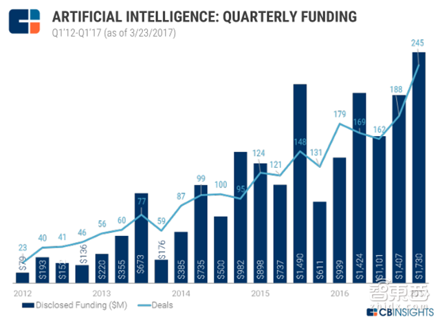 *人工智能2012-2017年第一季度融资情况(柱状图为金额,单位:百万美元;折线图为交易宗数)
