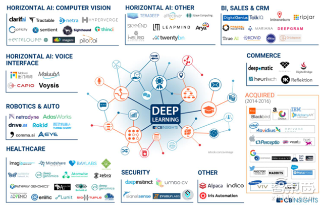 算法,尤其是深度学习算法领域,则不是巨头垄断,而是掀起了一波包括计算机视觉、语音交互、机器人/自动化、医疗、安全、消费、商务等领域的创业潮。巨头们往往选择更为基础的算法框架入手,进行开源,以构建自家AI生态,如谷歌的TensorFlow和微软的Cognitive Toolkit。
