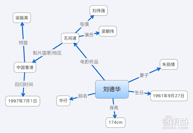 1)刘德华 (实体)– 妻子(属性) -> 朱丽倩(另一个实体)