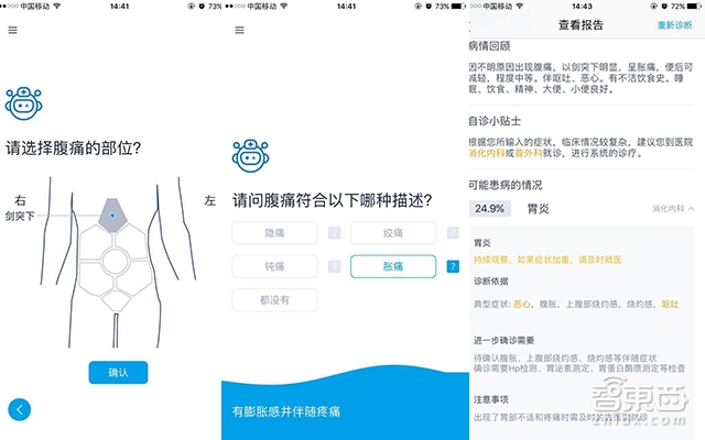 “机器人全科医生”其实是一个设立在医院挂号处的机器,内置了康夫子的预问诊系统,类似一个医疗类的聊天机器人(Chatbot)。在输入/点选了姓名、性别、年龄后,用户可以输入相应症状,比如“肚子疼得厉害”,系统将会模仿一个全科医生一样,一步步询问病患的病情,比如“腹痛最在是在什么时候出现的?”、“属于以下哪一种疼痛?”等等。