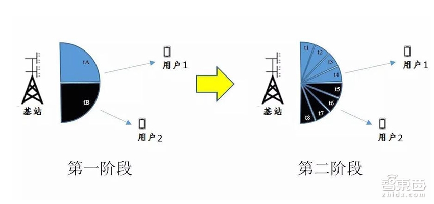 第一阶段为粗扫描,基站使用少量的宽波束覆盖整个小区,并依次扫描各宽波束对准的方向。如上图所示,基站在此阶段使用了宽波束tA和tB,且只为用户对准宽波束,对准方向精度不高,所建立的无线通信连接质量亦比较有限。