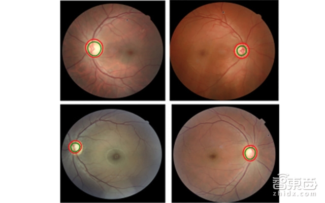 (图上显示的是四张眼球的背面图,Watson 检测视杯及视盘的大小。这一指标显示可能患者得了青光眼)。