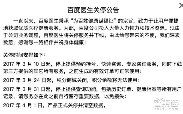 随后,百度在3月3日在官网上和官方微信号贴出公告,宣布停止百度医生服务,并于4月1日清空数据。目前,AI系统百度大脑在正常运行。