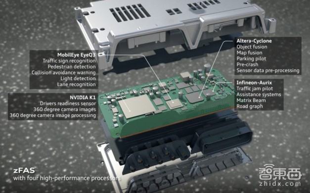 比如英飞凌。英飞凌作为老牌的半导体厂商,一直也和汽车行业保持着紧密的联系,为它们提供着车载娱乐信息芯片。在2015年,英飞凌也针对ADAS市场,给出了自己的芯片组Real 3 3D,可实现司机疲劳检测等功能。而在奥迪新A8使用的zFAS自动驾驶计算单元中,也使用了英飞凌提供的Aurix芯片,A8最关键的Traffic Jam Pilot,是由这块芯片最终实现的。