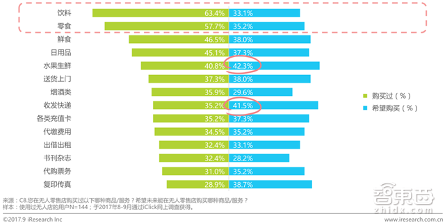 *2017年中国无人店用户购买和希望购买的商品品类分布