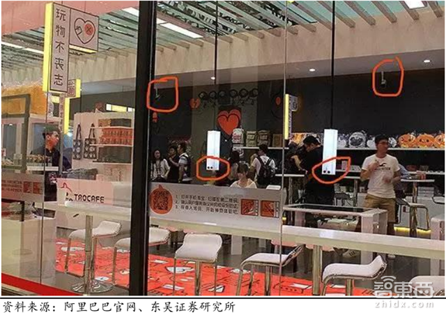 阿里“淘咖啡”的技术方案是基于生物特征自主感知和学习系统的身份确认(识别率是0.02%)和基于目标检测与追踪系统的顾客追踪。生物特征自主感知和学习系统,用于解决在开放空间里对消费者身份的识别问题,将顾客生物特征与淘宝 ID 进行绑定,以实现对顾客的身份确认。目标检测与追踪系统主要是追踪消费者在店内的行为及运动轨迹,该功能主要依赖多路监控摄像头。